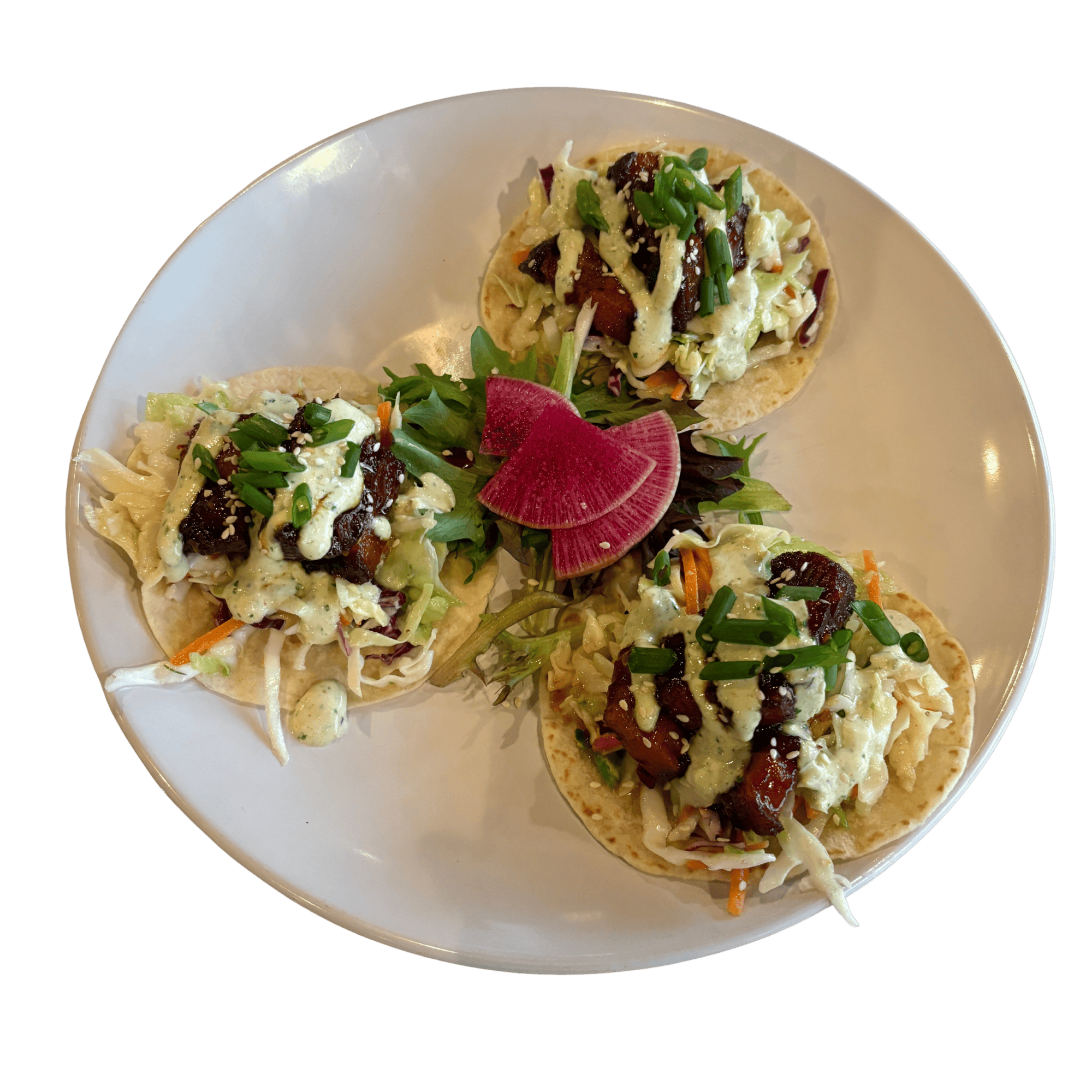 Hot honey teriyaki pork belly, slaw, cilantro crema, green onion, sesame