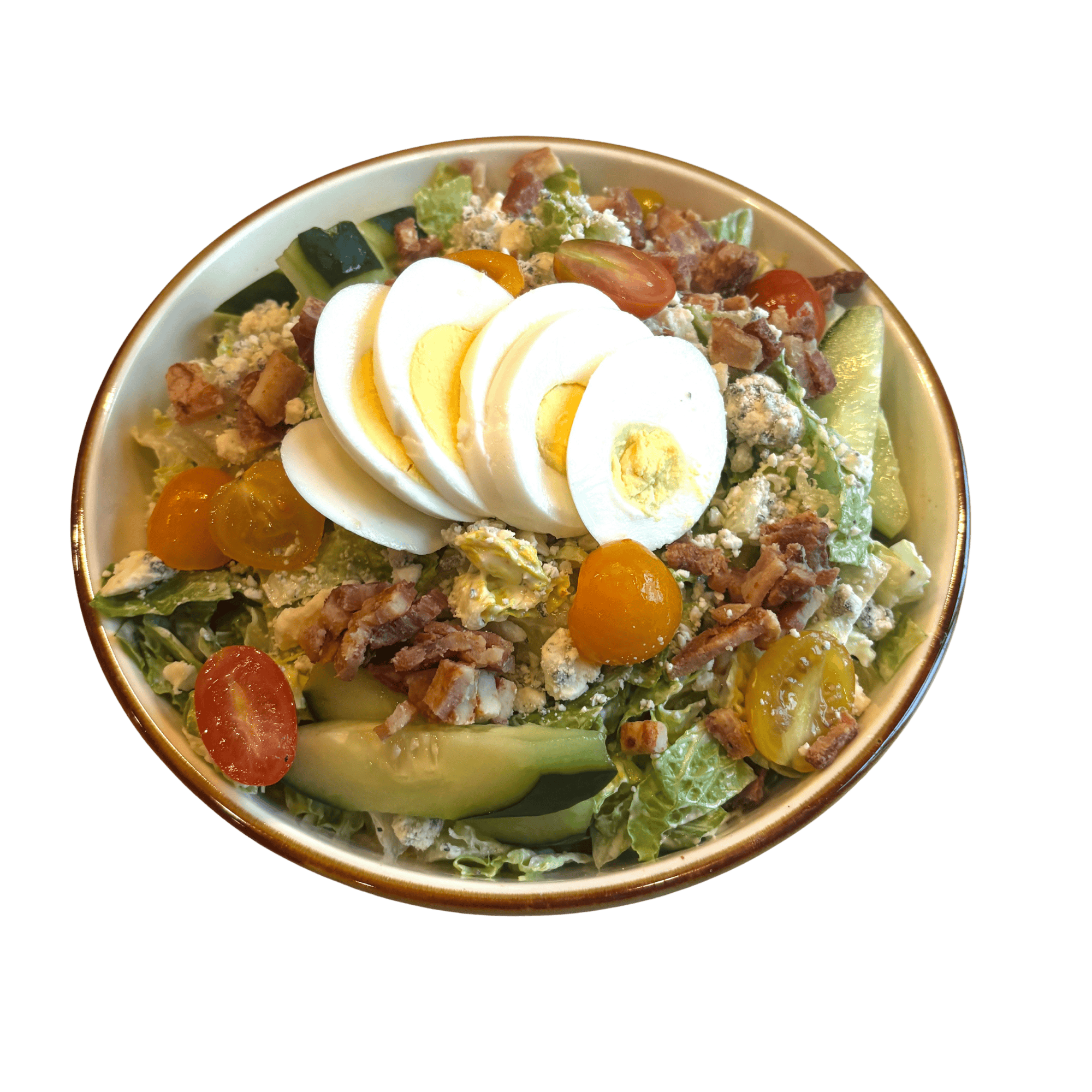 Romaine, bacon, gorgonzola, egg, tomatoes, cucumbers, ranch