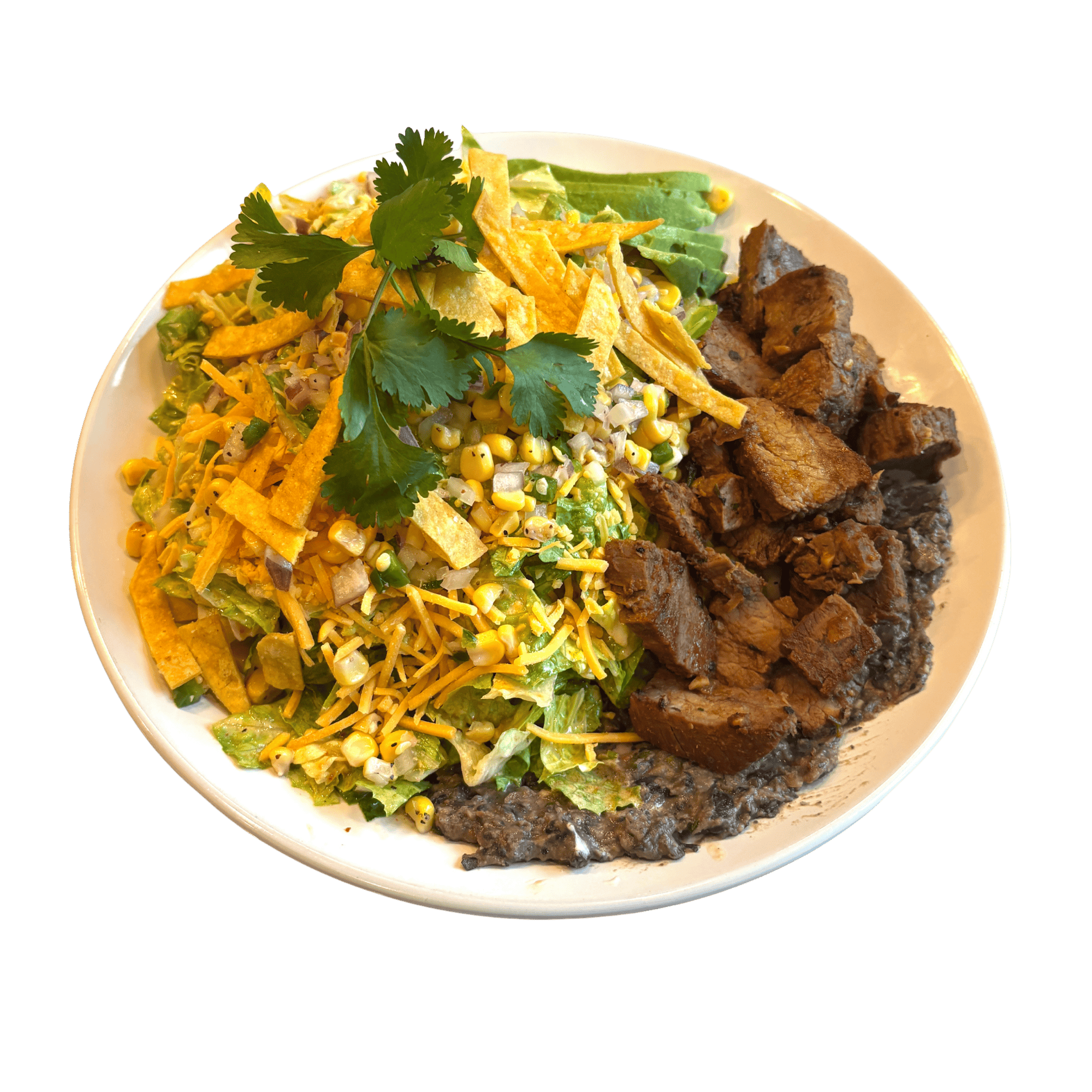 Carne asada, chili lime dressing, corn salsa, cheddar, romaine, black bean spread, avocado, tortilla crunch
