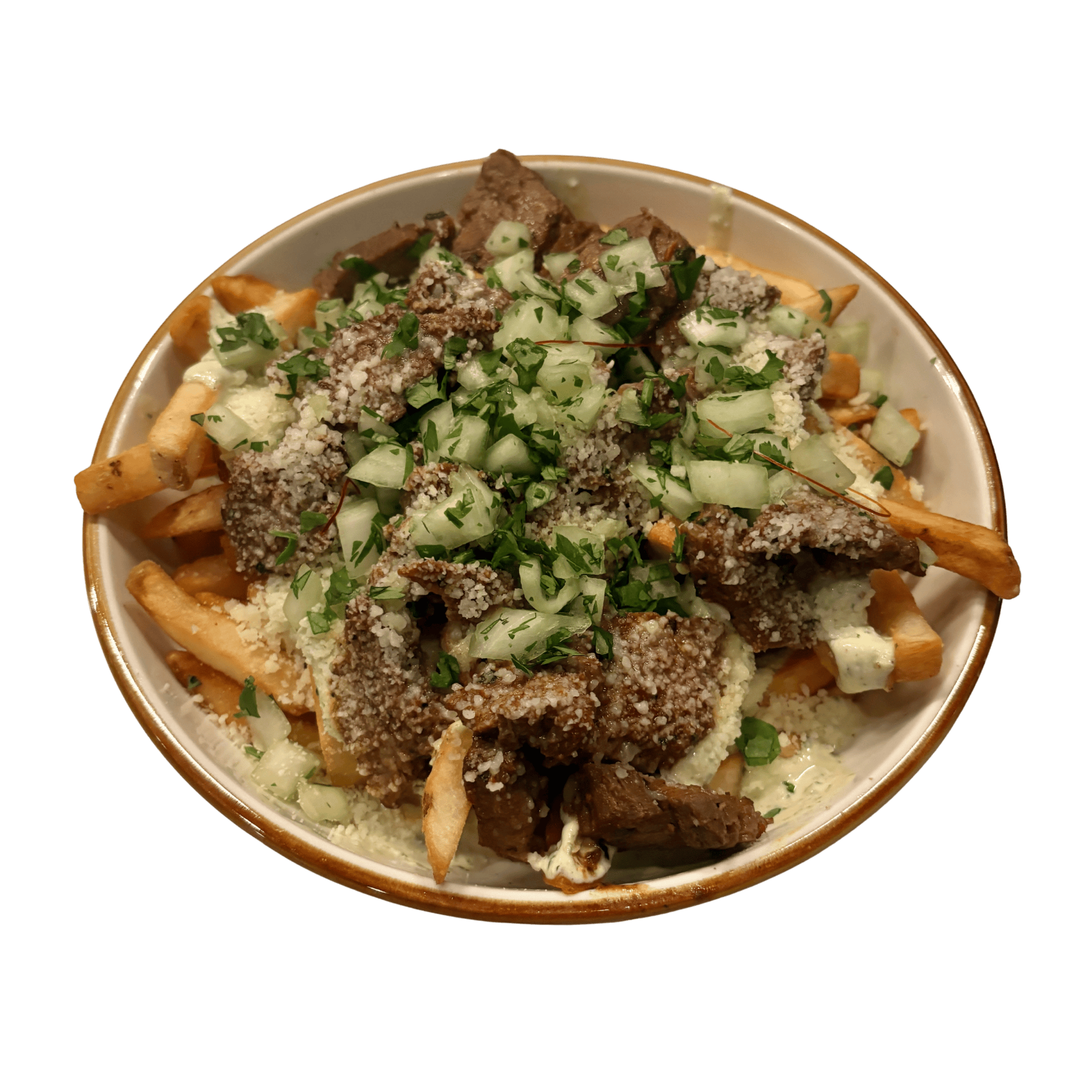 Crispy fries, carne asada, cilantro crema, cotija, cilantro & onion